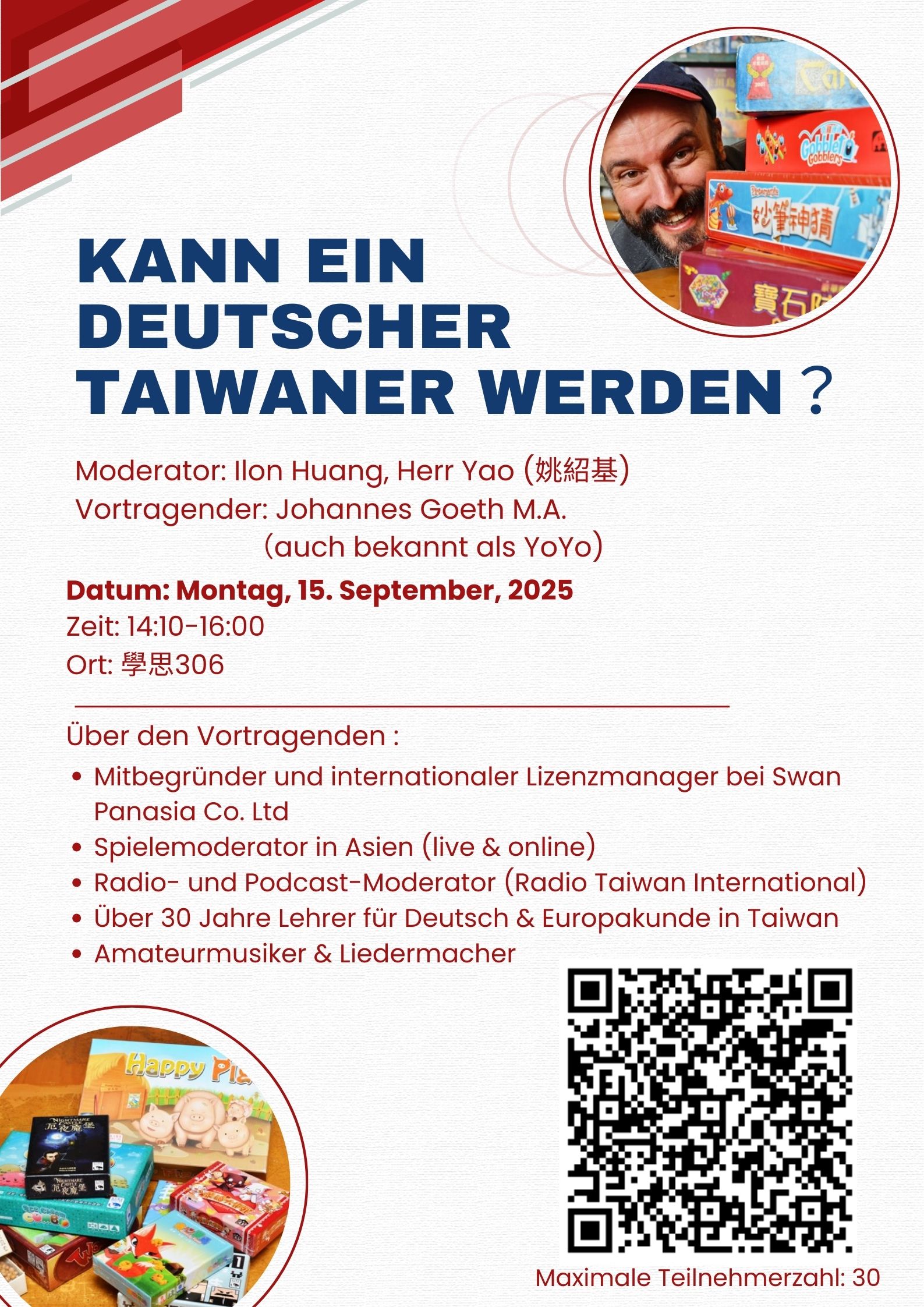 講題:KANN EIN DEUTSCHER TAIWANER WERDEN 主持人:黃逸龍(Ilon Huang)、姚紹基(Herr Yao) 時間:2025.09.15(一)14:10-16:00 地點:學思306 主講人:Johannes Goeth M.A. (YoYo)