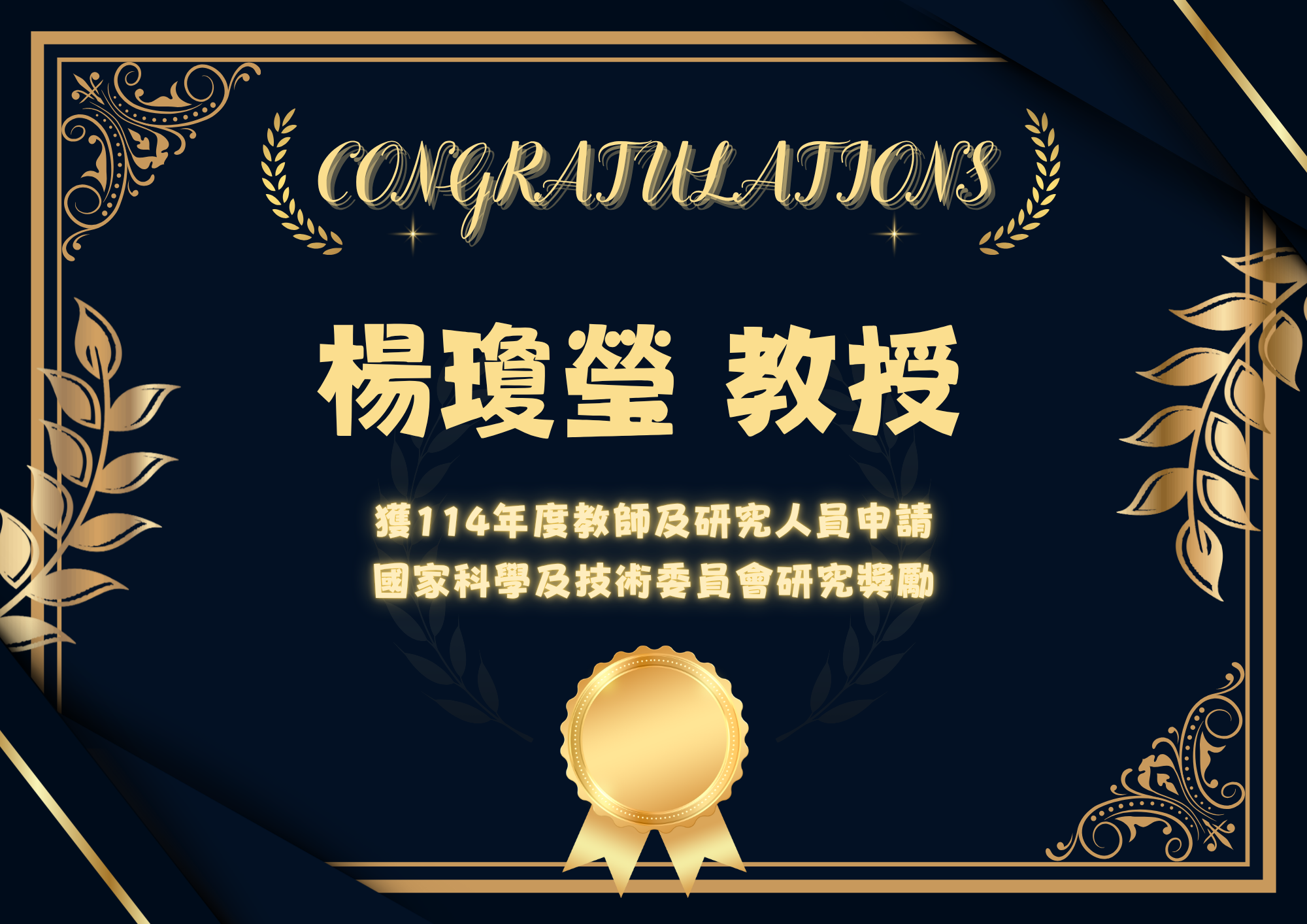 賀!楊瓊瑩教授獲114年度教師及研究人員申請國家科學及技術委員會研究獎勵